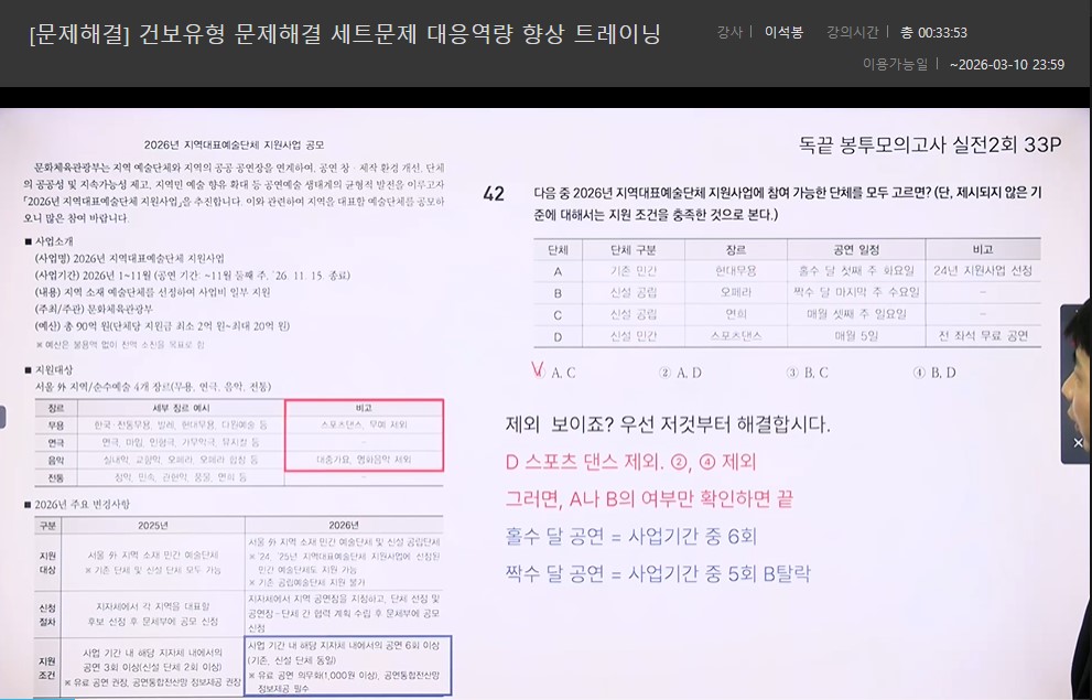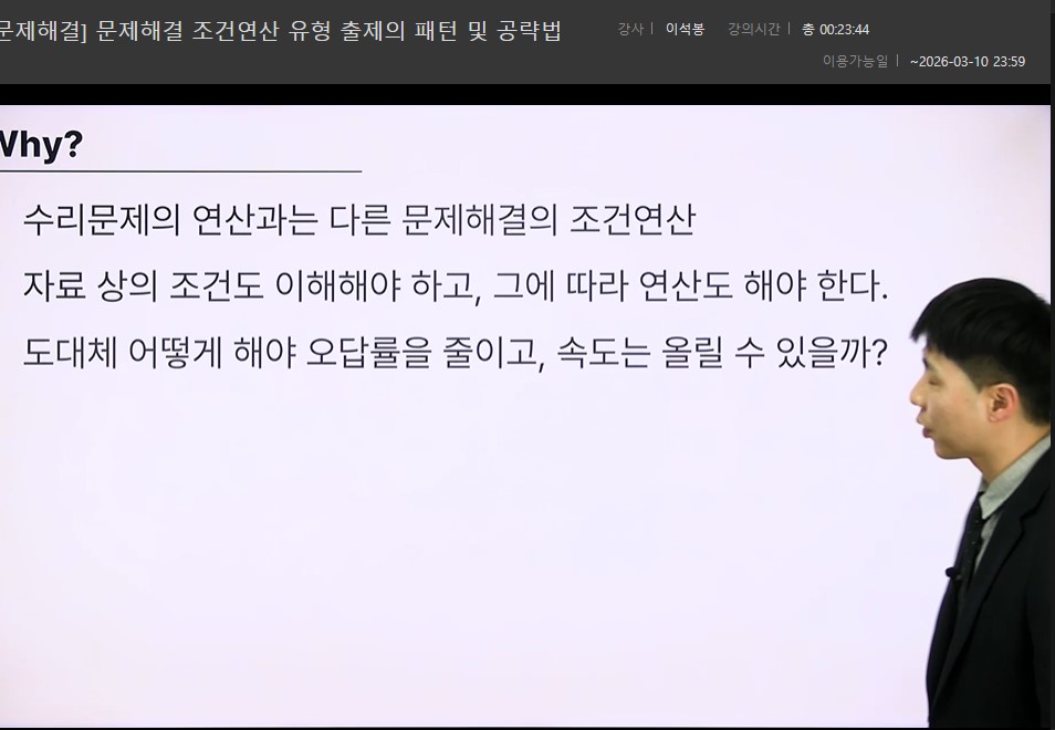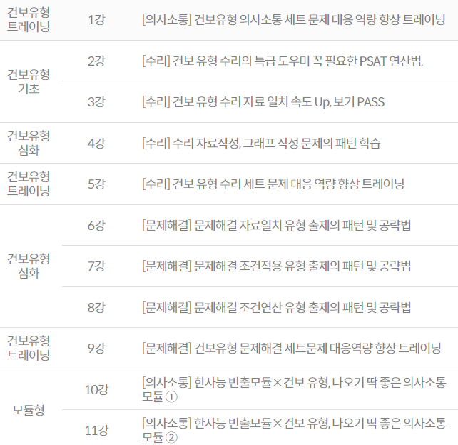 강의는 단순히 문제 풀이를 반복하는 방식이 아니라 자주 출제되는 유형을 중심으로 최적의 풀이 순서와 사고 흐름을 정립해 주는 실전형 커리큘럼으로 구성되어 있었습니다. 무작정 모든 선지를 다 따져보려던 기존의 나쁜 습관을 버리고, 필요한 조건부터 걸러서 적용하는 '읽는 순서'의 기술을 전수해 주어 풀이를 한결 깔끔하게 만들어 주었습니다. 또한 다양한 풀이 팁과 정답 판별 기준은 손이 멈추는 시간을 획기적으로 줄여주었습니다. 특히 경로 문제나 추론 유형을 다룬 심화 강의는 복잡한 구조를 유형화하여 무작정 계산이나 답 찾기 시도부터 하던 저의 나쁜 습관을 완전히 고쳐놓았습니다.