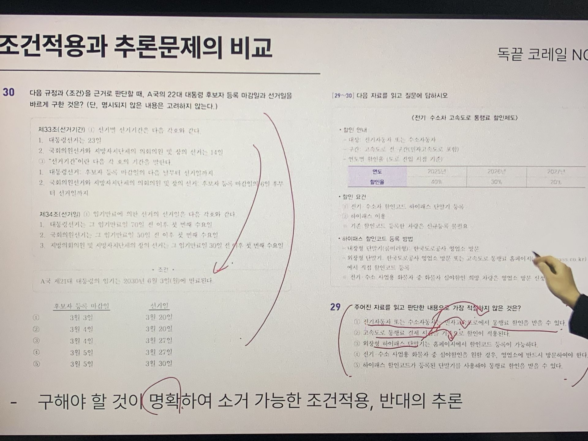 강의는 단순히 문제 풀이를 반복하는 방식이 아니라 자주 출제되는 유형을 중심으로 최적의 풀이 순서와 사고 흐름을 정립해 주는 실전형 커리큘럼으로 구성되어 있었습니다. 무작정 모든 선지를 다 따져보려던 기존의 나쁜 습관을 버리고, 필요한 조건부터 걸러서 적용하는 '읽는 순서'의 기술을 전수해 주어 풀이를 한결 깔끔하게 만들어 주었습니다. 또한 다양한 풀이 팁과 정답 판별 기준은 손이 멈추는 시간을 획기적으로 줄여주었습니다. 특히 경로 문제나 추론 유형을 다룬 심화 강의는 복잡한 구조를 유형화하여 무작정 계산이나 답 찾기 시도부터 하던 저의 나쁜 습관을 완전히 고쳐놓았습니다.