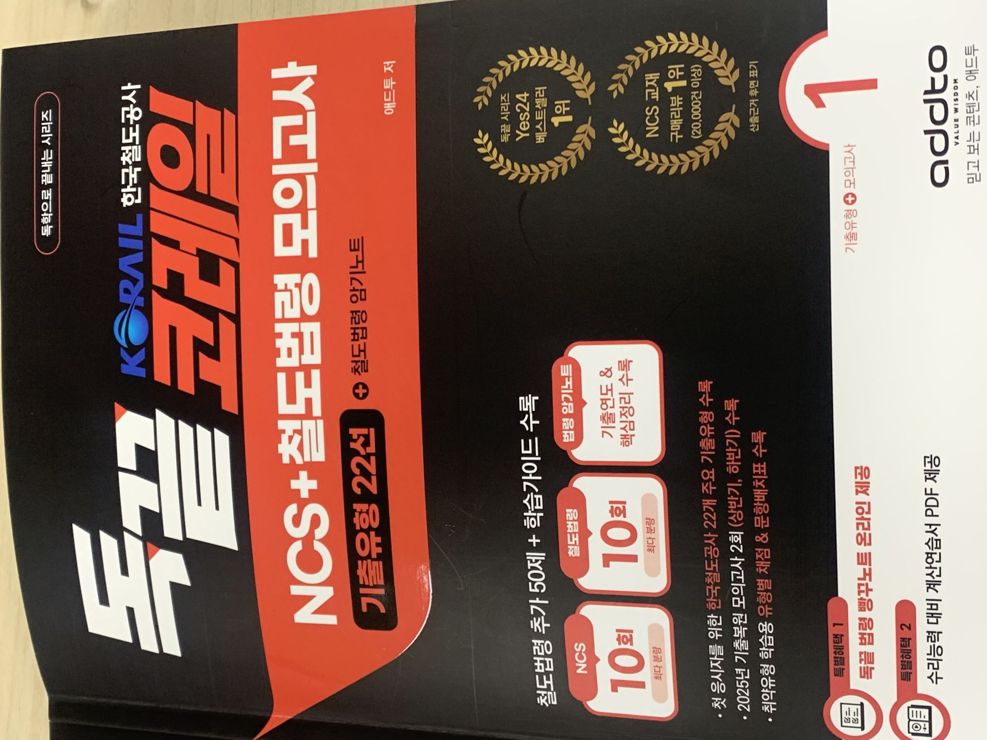 관련 내용을 찾아보다가 애드투 NSC 이석봉 강사님을 발견하게 되었고, 할인까지 받아 코레일NCS 파이널 합격 컷 강의를 수강했습니다. 책은 첨부된 이미지 참고 부탁드립니다 -> NCS공부를 처음 접하는 사람으로서 강의만 듣는거는 한계가 있다고 생각합니다. 교재로 다양한 유형을 접하는게 중요한 것 같습니다.