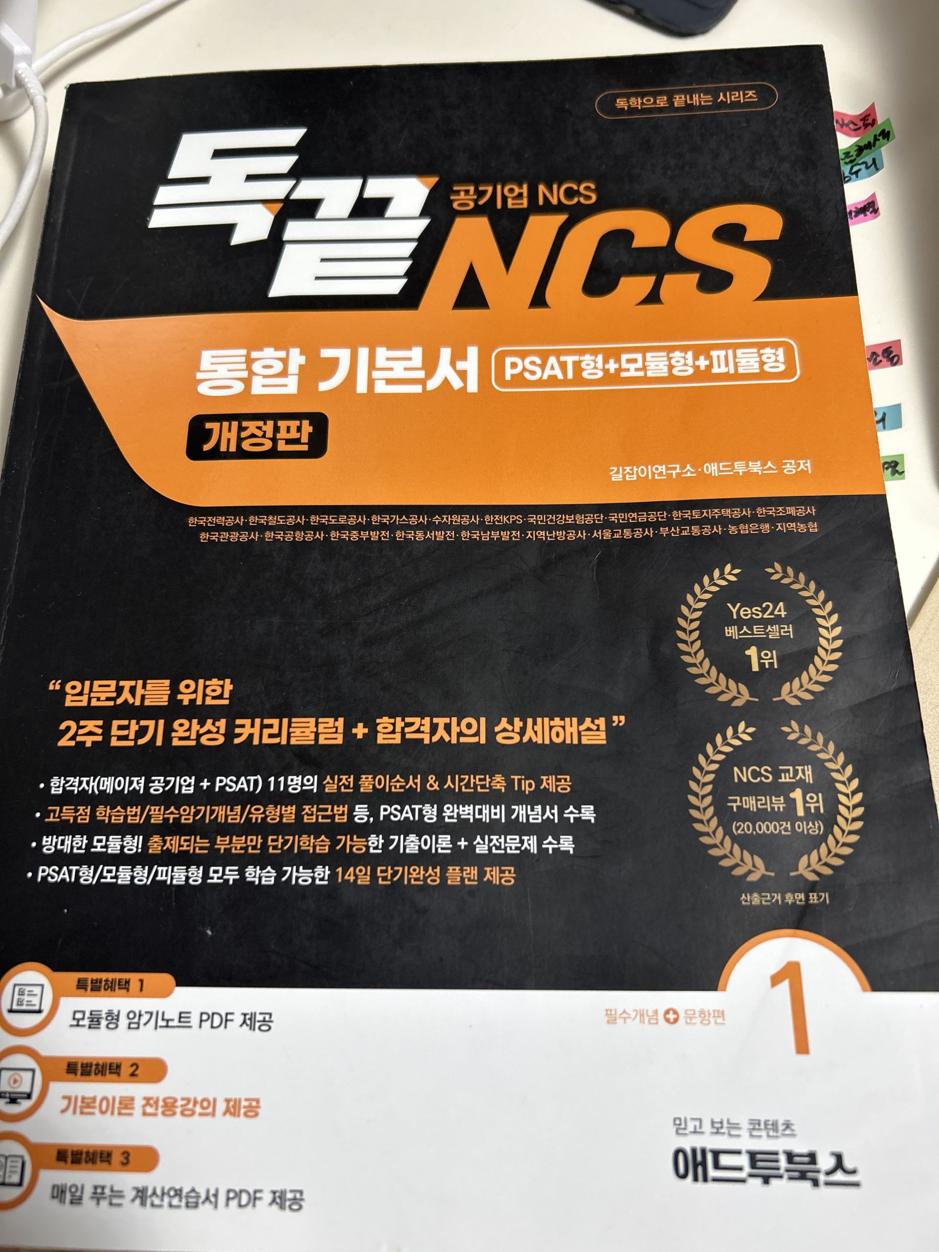 - kaka**** / 2025-04-18 BEST #학습량이 적당해요 #초보자 추천 +4 일단 NCS 초보자로서 기본 인강을 들어볼 필요가 있겠다고 느꼈고, 애드투 (박수웅·길자은 독끝 NCS 통합 기본서 이론+문풀(모듈편+피셋편)) 인강을 구매했습니다. 두 분이 파트별로 나누어 강의 진행해주십니다. NCS를 처음 접하는 입장에선 박수웅 강사님의 계산 팁들이 매우 유익했습니다. 500제 인강도 들어보고 싶을 정도로요.. 특히 응용수리가 좋습니다. 속력문제, 소금물문제, 일률문제뿐 아니라 배수문제나 몰아주기 방식 등도 알려주셔서 도움이 많이 됩니다. 교재는 고등학교 수학의 정석 느낌이 납니다. 예제 문제 하나하나 잘 되어있고 기본문제+고난도문제까지 풀이가 정말 꼼꼼하게 적혀있습니다. 솔직히 교재가 진짜 좋은 것 같습니다.. 전에 타 교재로 한 일주일 끄적여 볼 기회가 있었는데 그건 답지에 풀이 1줄 끝인 문제가 많았거든요. 여긴 그런 문제가 아예 없습니다. 풀이가 기본 반 페이지예요. 물론 수리나 자원관리, 문제해결은 따로 500제 더 풀어봐야 풀이 속도가 붙겠지만, 애드투 기본서가 시중 기본서 교재들 중 가장 이론이 자세한 교재인 듯 합니다. 기본서 문제풀이만 3회독 중이고 응용수리 500제도 풀기 시작했습니다. 문제를 더더더 빨리 풀 수 있게 되면 좋겠네요.