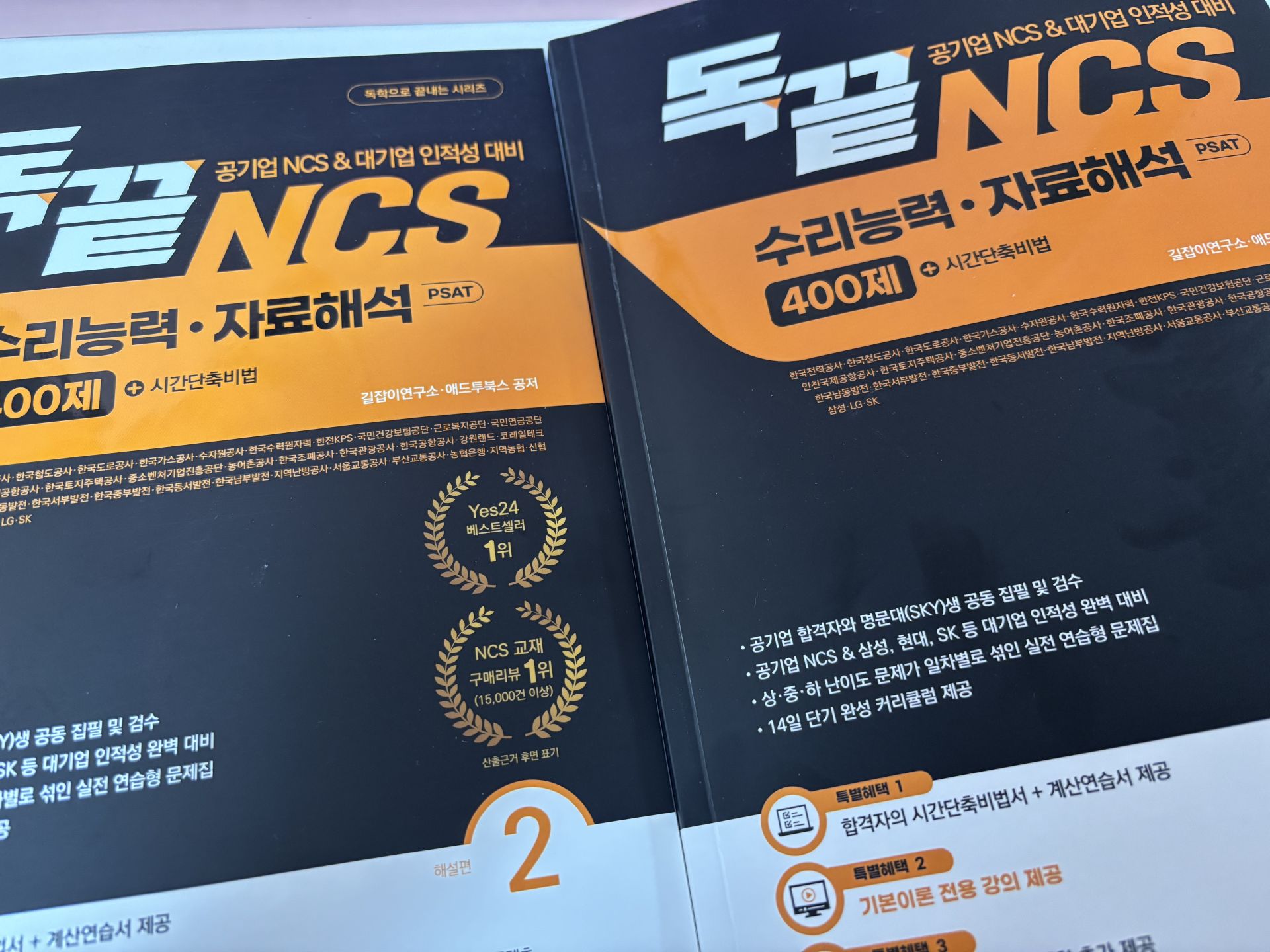 - nave**** / 2025-01-31 BEST #커리큘럼이 좋아요 #꿀팁이 가득해요 +3 독끝 NCS 문제해결능력+자원관리능력을 사용해보고 좋아서 수리능력, 자료해석도 풀어봤다. 수많은 공겹 취준생들에게 혼자 독학하기에 정말 좋은 교재고 인강이라고하는데, 왜 그런지 지난번 문제해결능력+자원관리때도 느꼈지만 이번 수리능력, 자료해석 교재를 보면서도 또 느꼈다. 공기업 준비하는 독학러들에게 진짜 추천할만한 교재랑 인강이라고 생각된다. 공기업, PSAT 합격자의 NCS 문제풀이 시간단축 팁을 전체 문항에서 배울 수 있어 빠르게 답을 찾는 연습이 가능한 교재였다. 본격적으로 학습을 하기 전에 교재를 꼼꼼히 살펴봤다. 해설이 아주 상세하게 있는데, 어느 교재를 공부하던 해설이 상세한게 진짜 좋더라! 특히나 독학할때에는 진짜 중요한게 해설인것 같다. 또 난이도별로 매일 연습할 수 있도록 학습 스케쥴이 짜여있고, 합격자의 실전 노하우도 있다! 이번에도 해설이 진짜 자세하고 두껍다는 점이 큰 장점으로 다가왔다. 1일차, 2일차 이렇게 일자별로 구분되어 있어서 학습 계획을 세우기에 좋았고, 혼자 공부하는 사람들이나 처음 시작하는 사람들이 쉽고 체계적으로 접근할 수 있도록 학습 플랜과 학습 가이드를 상세하게 제공해줘서 든든했다. 초보자의 경우 정확한 학습이 중요하므로 1일치를 2일에 걸쳐서 해도된다고하니 너무 부담스럽지 않게 도전할 수 있겠다. 틀린 문제는 교재만큼 두껍고 엄청나게 상세한 해설로 왜 틀렸는지, 어떻게 하면 좋을지 다시 확인해볼 수 있다. NCS 자료해석에서 자주 출제되는 모든 유형을 빠르게 출 수 있는 접근법이 다양하게 수록되어있고, 모든 문항에 걸쳐서 상세한 해설이 있어서 진짜 독학하는 사람들에겐 정말 힘이 될 것 같았다. 각 문제에 대한 풀이 뿐 아니라 선지에 대한 풀이도 있어서 헷갈리는 선지에 대해 더 확실히 하고 넘어갈 수 있었다. 계산 풀이 과정을 생략하지 않고 자세하게 설명해줘서 초보자도 쉽게 배울 수 있을 것이라 생각된다. 그리고 맞춘 문제더라도 내 풀이 방법이 맞는지 확인해보기 좋고, 합격자의 실전 문제 풀이 순서를 통해 새로운 인사이트를 얻어서 빨리 감잡기에도 좋고 더 빠르게 답을 찾는 연습이 가능하다는 점이 좋았다. 애드투에서 강의를 신청하면 기본적으로 '수리.기초 수학'과 '독끝 NCS 문제 수리능력, 자료해석' 강의를 수강할 수 있다. 강의는 이론 강의와 문제 풀이 강의로 구성되어있는데, 이론+기출 강의에서는 시간단축 비법강의 내용을 가지고 처음 도전하는 사람도 쉽게 핵심 개념과 실전에 사용할 수 있는 팁들을 확실하게 배울 수 있다. 강의는 선생님 딕션이 좋아서 또박또박 잘 들리고, 교재를 화면에 꽉 띄운채 화면공유를 하는 형식으로 진행돼 과외받는 느낌도 들었고 편했다. 또 판서해주는대로 따라가다보면 쉽고 확실하게 내용을 습득할 수 있었다. 교재 해설에는 없는 여러 팁들이나 스킬도 배울 수 있고 더 빠르게 이해할 수 있는데다가 다양한 접근법도 배울 수 있으니 교재와 강의를 같이 활용하는게 좋을 것 같다. https://blog.naver.com/ind04156/223736226614 https://blog.naver.com/ind04156/223734925989