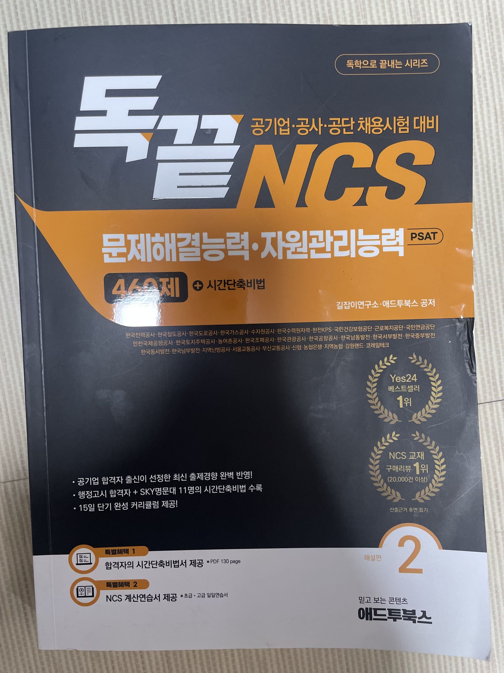 관련 내용을 찾아보다가 애드투 NSC 이석봉 강사님을 발견하게 되었고, 할인까지 받아 코레일NCS 파이널 합격 컷 강의를 수강했습니다. 책은 첨부된 이미지 참고 부탁드립니다 -> NCS공부를 처음 접하는 사람으로서 강의만 듣는거는 한계가 있다고 생각합니다. 교재로 다양한 유형을 접하는게 중요한 것 같습니다.