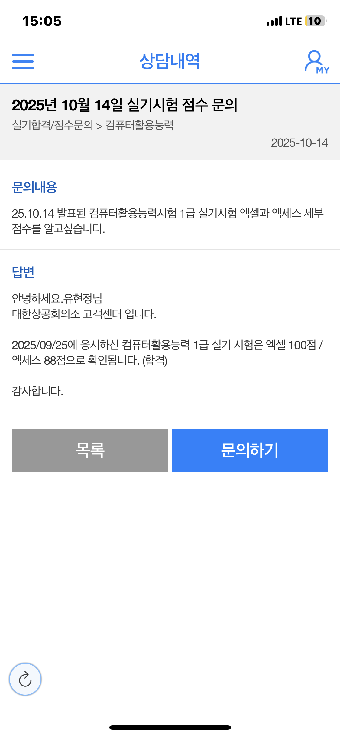 내돈내산 컴활1급 실기 합격후기! 24년도 필기합격하고 실기불합 후 올해 이미남 선생님을 만나고 다시 시작했어요~ 애드투 이미남 컴활강의를 선택하게 된 계기는 쉽고 천천히 알려줘서 수강했어요. 저의 총 공부 기간은 2월부터 5월까지 3개월 정도 퇴근 후 매일 3시간, 주말 10시간씩 공부했어요. 퇴근 후 하기 싫을 때도 있었지만 조금만 하면 합격할 것 같은 느낌과 언젠가는 합격하겠지라는..ㅋㅋ 마음으로 계속해서 응시했어요.. 총 5번 응시 하였고 마지막에 극적으로 합격 ㅎㅎㅎ 첫 시험은 강의 다 듣고 호기롭게 실기시험에 응시했는데 결과는 처참했어요. 안되겠다 싶어서 문제풀이와 복원문제를 계속해서 본 후 2번째 시험.... 또 불합격... 2번째 시험부터는 시험장 나오자 마자 문제를 간단하게 적은 후 못풀었던 문제.. 처음 본 문제를 선생님께 바로 물었어요. 주말에도 바로바로 답변해주시고 용기를 주신 덕분에 멘탈이 흔들려도 계속해서 도전하게 되었어요. 어떤점이 가장 도움이 되었냐고 물어보면 거의 실시간에 가까울 정도로 답변해주신 점이 큰 도움이 되었어요. ㅎㅎㅎ 3번째 응시 할때는 기출위주로 특히 함수부분은 4개는 맞춘다는 생각으로 함수만 봐도 어떤식으로 풀어야 되는지 바로 나올 때까지 연습했어요. 결과는 엑셀은 합격, 엑세스는 불합격.. (자리운도 있다는걸 이때 알았음.ㅎㅎ) 이미남 컴활은 기출정리가 잘되어있어서 역시 4번째와 5번째도 계속 반복했어요. 결과는 5번째 합격 ㅎㅎㅎ 역시 반복학습이 최고였어요. ㅎㅎㅎ 끝까지 할 수 있도록 도와주신 이미남 선생님께 감사의 말씀을 드립니다.
