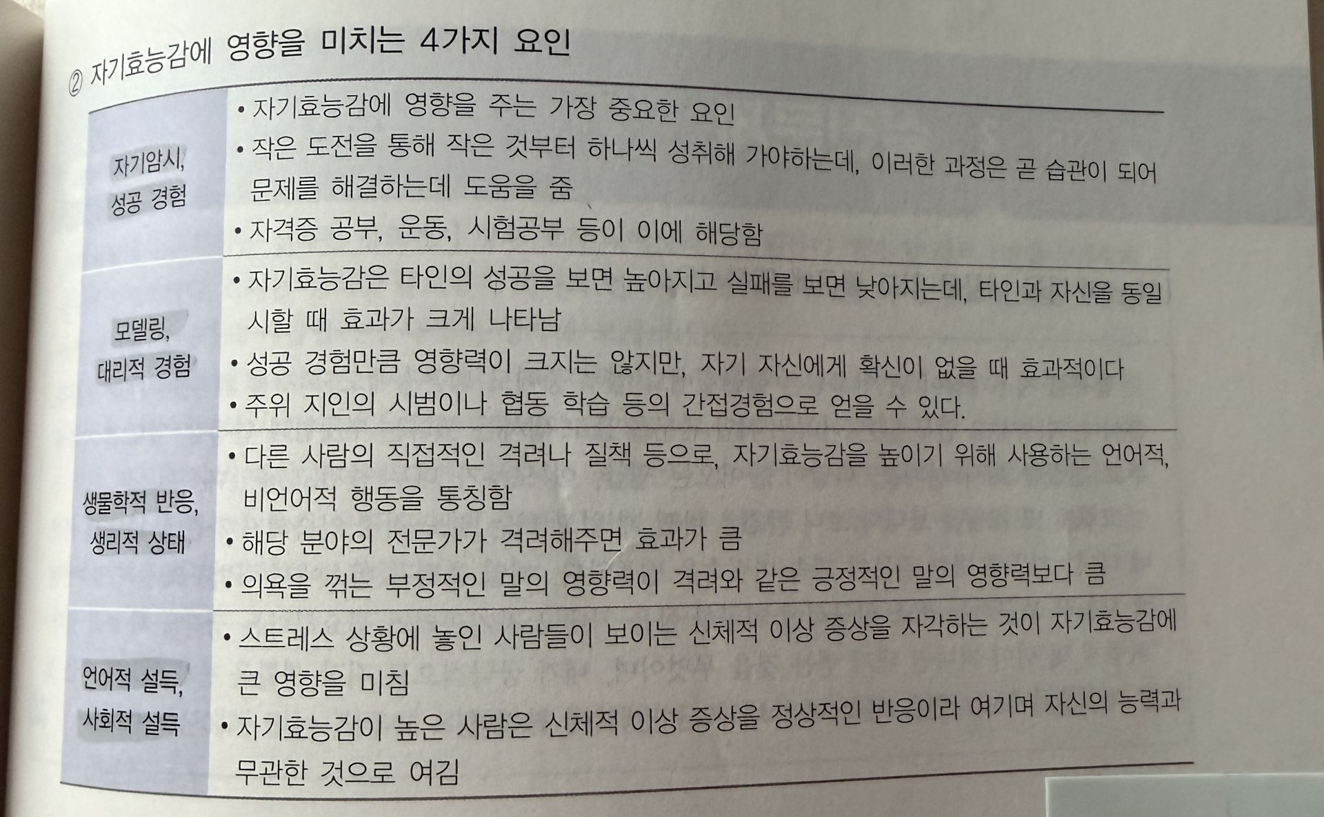 자기개발 p545의 ‘자기효능감에 영향을 미치는 4가지 요인‘ 중 ‘생물학적 반응, 생리적 상태‘와 ‘언어적 설득, 사회적 설득‘의 설명이 바뀐 것 같습니다.